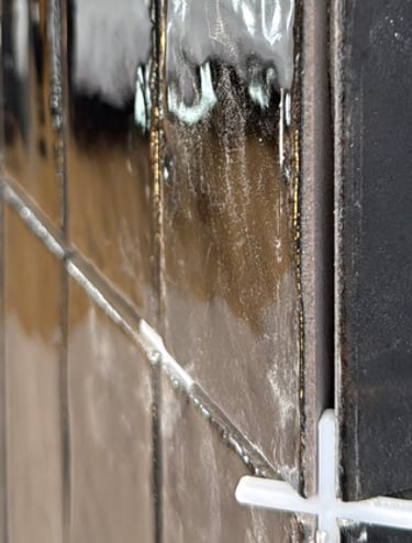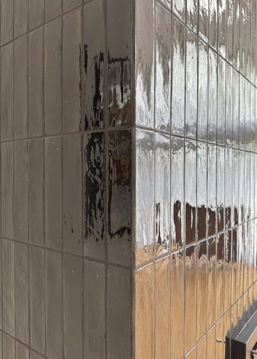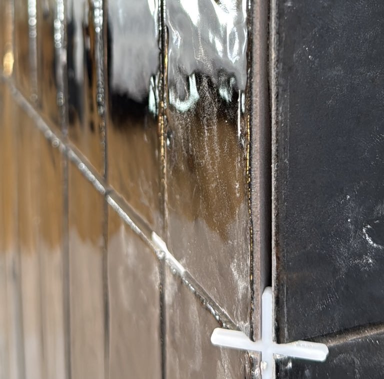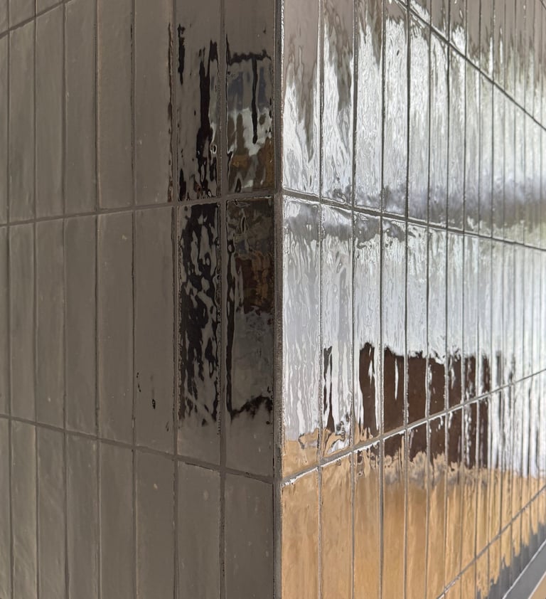We used glossy black brick-style tiles, laid vertically to emphasise height and visual drama. The deep, rich tone of the tiles was enhanced by black grout, creating a unified surface with a striking reflective finish. Every corner was expertly mitred, eliminating trim and showcasing clean, crisp lines that elevated the design’s minimalist ambition.