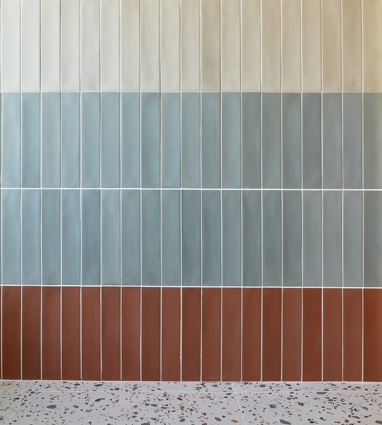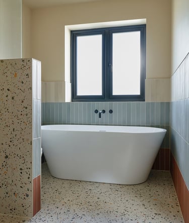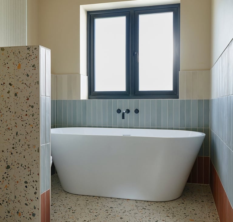 To break up the surfaces and add a bold architectural touch, we installed a strong contrasting tile strip, laid with careful alignment to create a sense of flow and movement through the space. The result is a clean, contemporary design with just the right amount of visual edge.