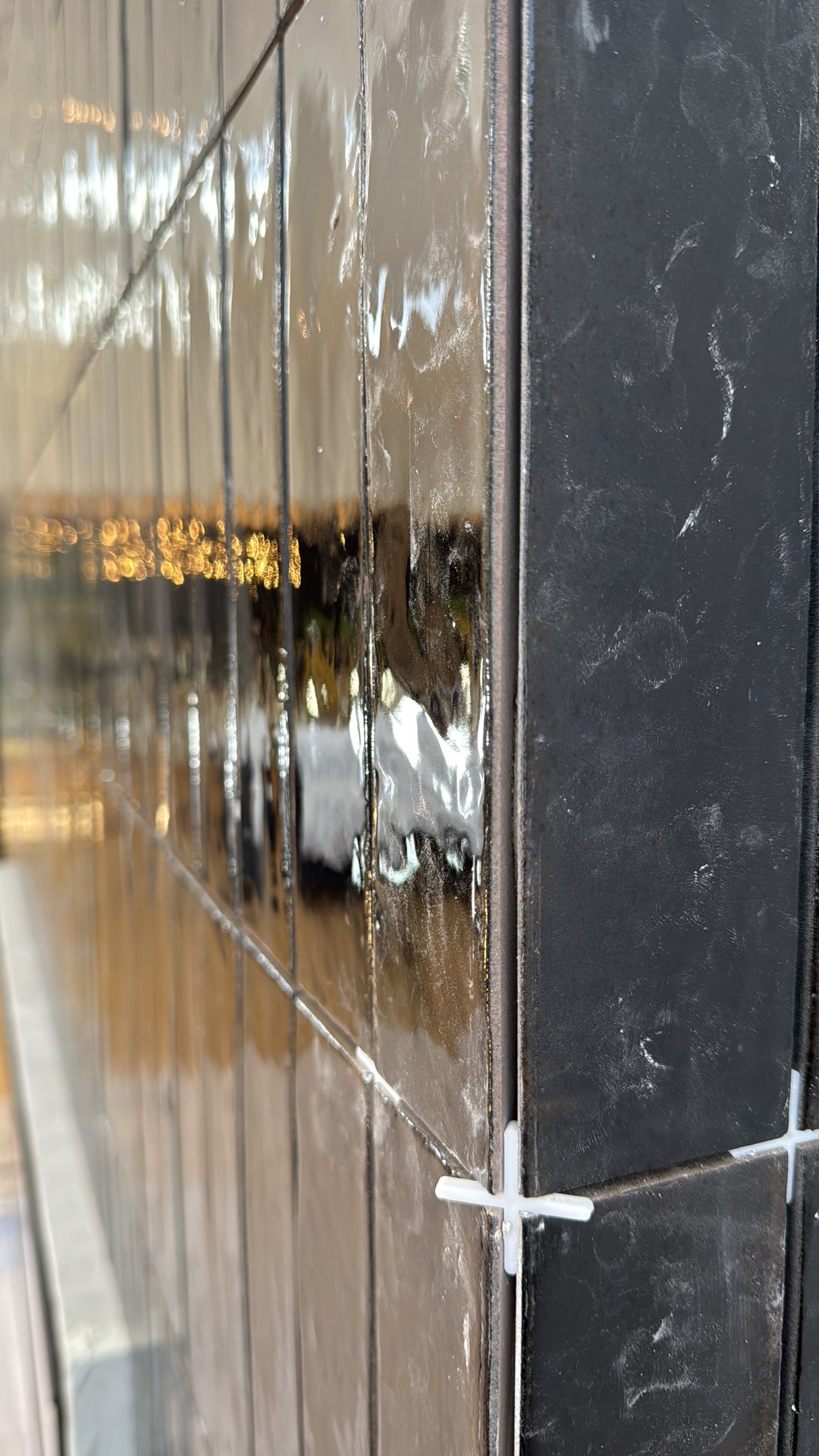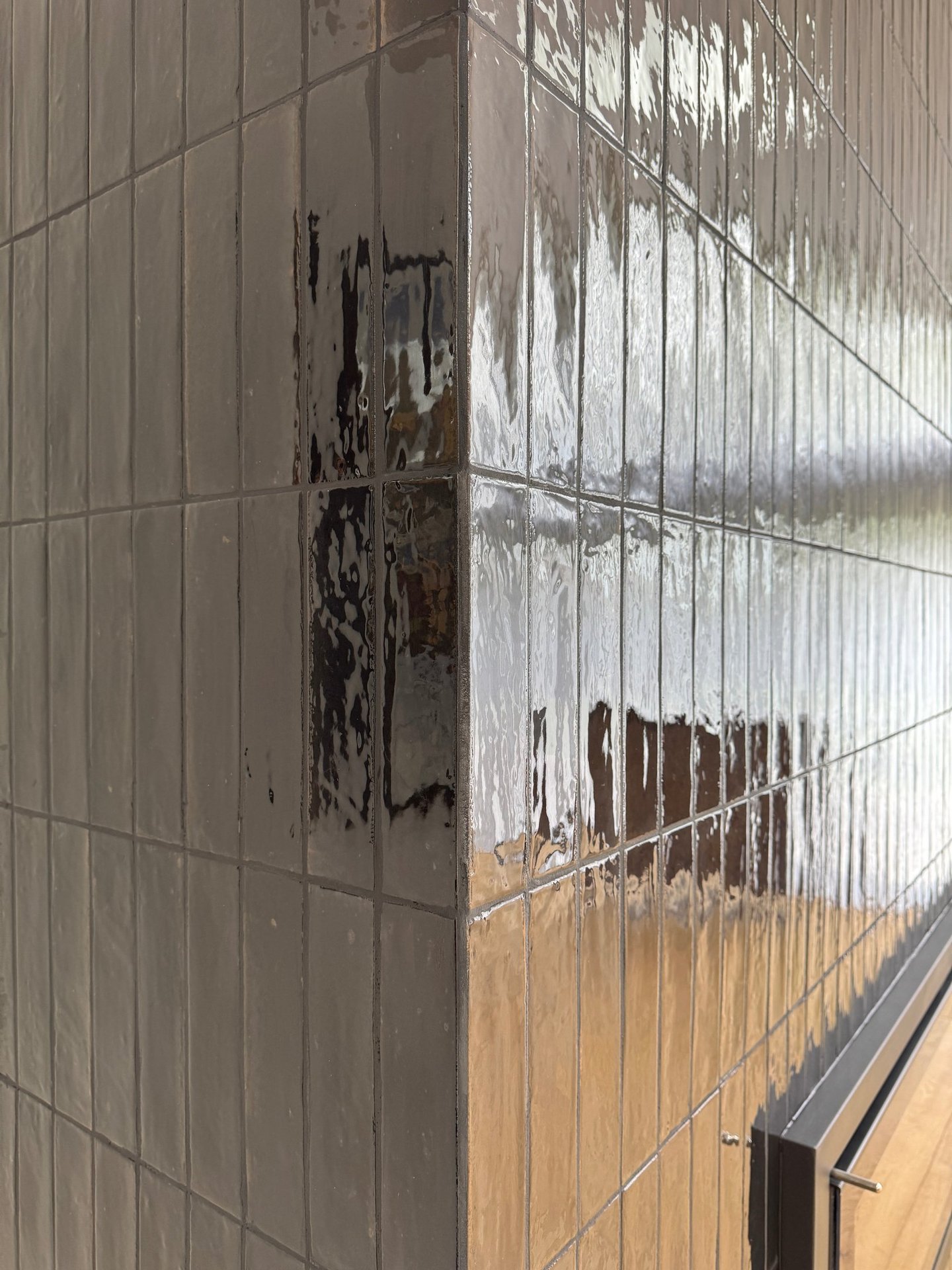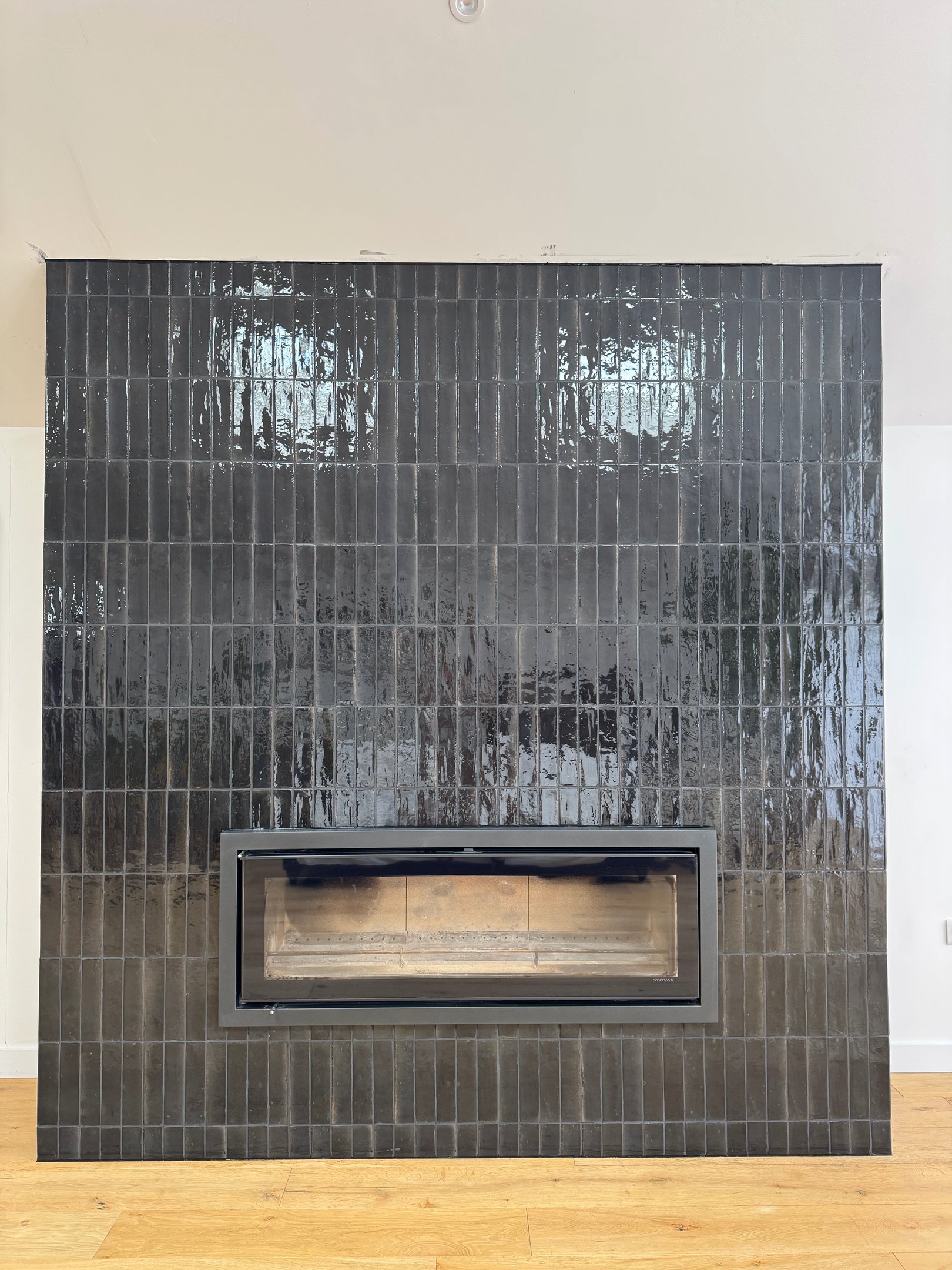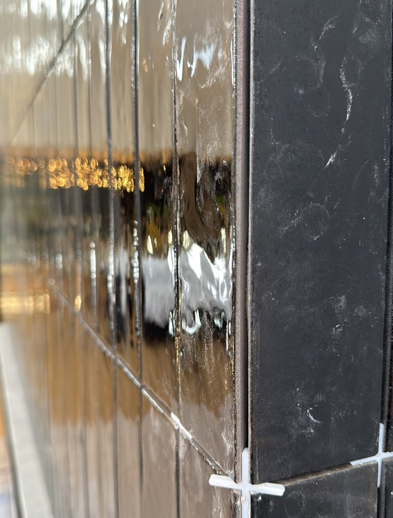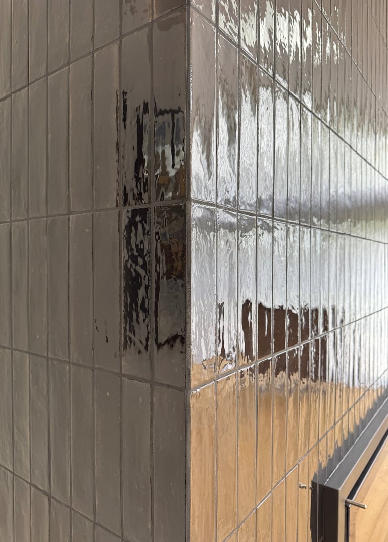 We used glossy black brick-style tiles, laid vertically to emphasise height and visual drama. The deep, rich tone of the tiles was enhanced by black grout, creating a unified surface with a striking reflective finish. Every corner was expertly mitred, eliminating trim and showcasing clean, crisp lines that elevated the design’s minimalist ambition.