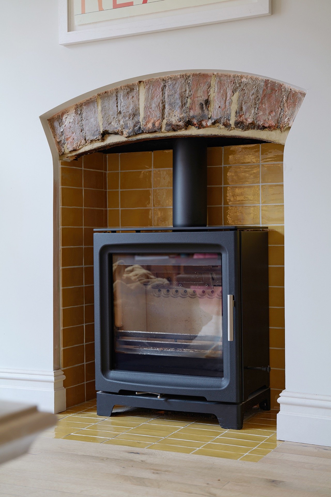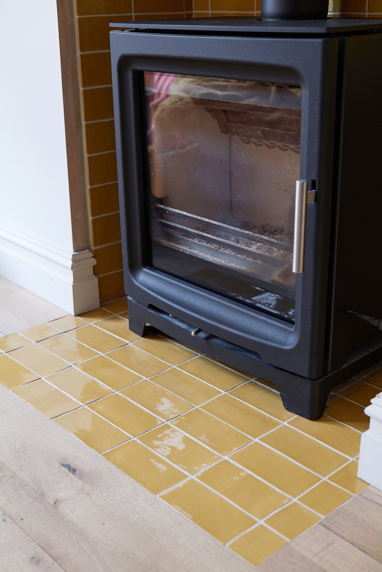 For the first fireplace, we installed Little Greene Bassoon Rectangle metro tiles from Bert & May in the deep ochre glazed finish. The rich mustard tone adds warmth and depth to the fireplace recess, pairing beautifully with the exposed brick arch and the modern black log burner. The glossy glaze catches natural light throughout the day, bringing subtle tonal variation and life to the tiled surface.