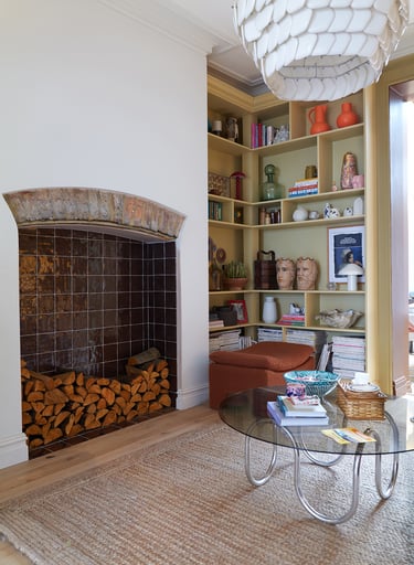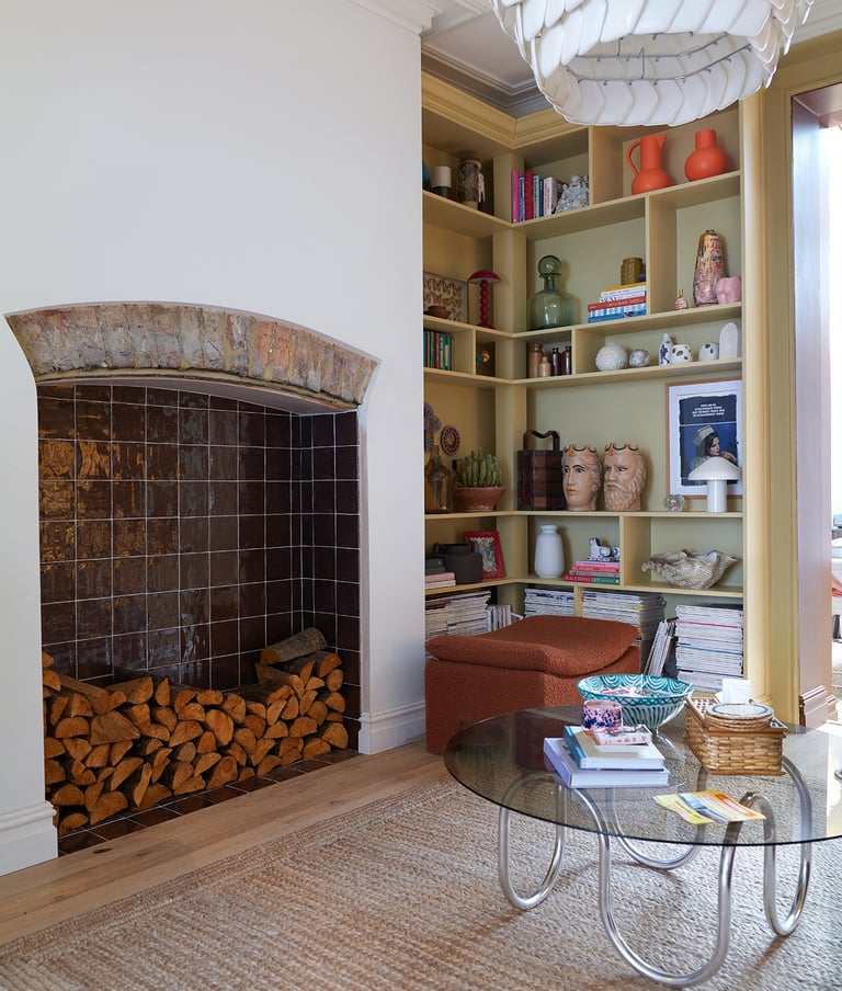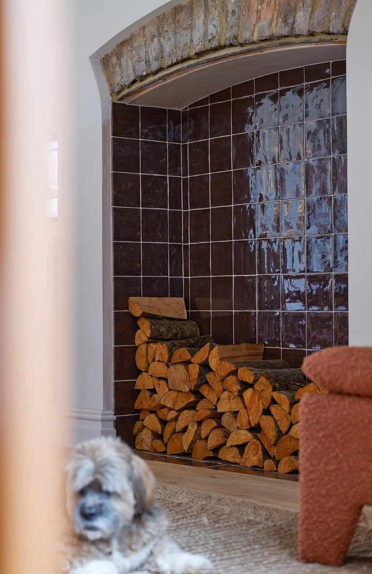 The second fireplace was tiled using Purple Brown glazed square tiles, also from Bert & May. These tiles introduce a deeper, more dramatic colour, with natural variations in the glaze enhancing the handcrafted feel. The darker tones create a strong visual anchor within the room while maintaining the warm, layered look that defines the home’s interior style.