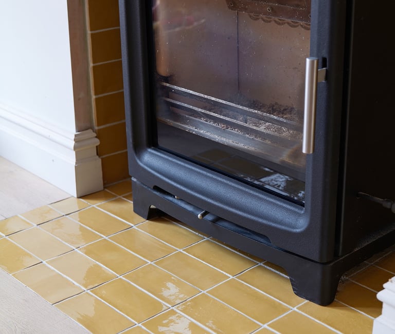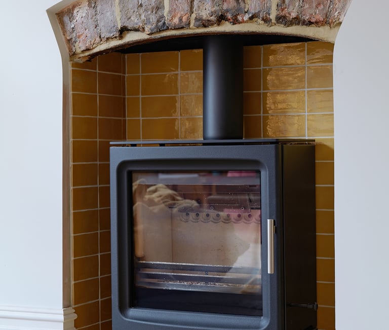 Each tile was carefully aligned and installed with precision to maintain consistency while still celebrating the natural irregularities of the handmade surfaces. By extending the tiling across the fireplace recess and hearth, the installations frame the stove beautifully while providing a durable and practical surface.